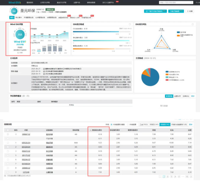 近日,国内权威的金融数据服务提供商万得(Wind)发布公司最新的ESG评分评级结果。圣元环保(300867.SZ)凭借在环境、社会和公司治理(ESG)领域的卓越表现和管理成果获评“AA”级,在Wind ESG综合得分中获评8.18分,在环保行业141家公司中位列第3名。