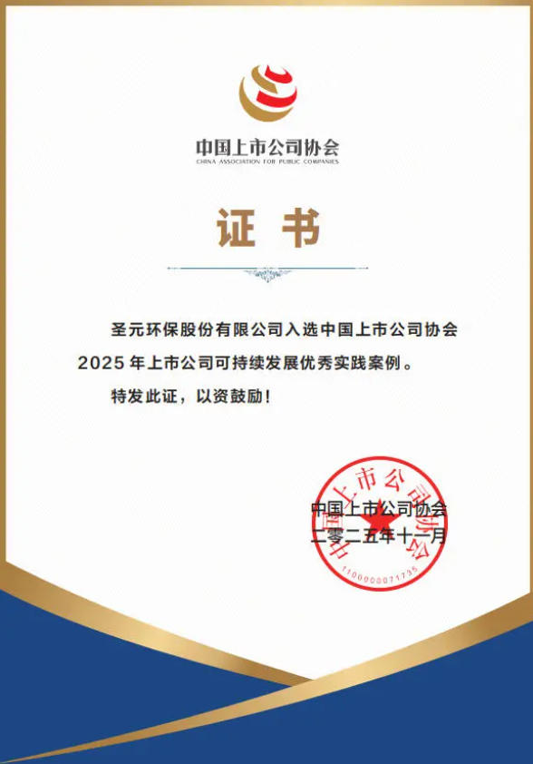 11月18日,由中国上市公司协会主办的2025上市公司可持续发展大会在北京举办,汇聚监管机构、国际组织、上市公司、投资机构及评级机构代表等专业意见,围绕企业ESG管理体系建设、绿色运营实践、社会责任履行以及创新发展能力等核心维度展开系统评估。圣元环保凭借其在可持续发展领域的卓越实践,成功入选中国上市公司协会“2025年上市公司可持续发展优秀实践案例”,彰显了其在环保产业的领先地位与责任担当。